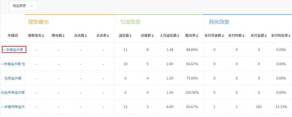 产生数据的关键词,主要就是与一字肩连衣裙相关的关键词。